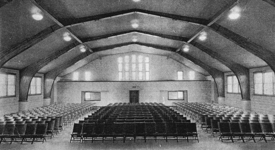 Interior of the completed Peshtigo, Wisconsin, school gymnasium (source: Forest History Society) – first building in the United States to use structural glue-laminated timber (glulam).